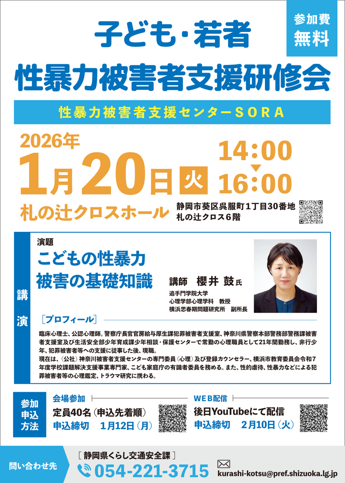 静岡県では、子ども・若者の性暴力被害者に寄り添った対応ができる人材を育成するため、子どもや若者の性暴力被害者支援に関わる、子ども・福祉・女性相談・被害者等支援・教育関係等職員や警察、被害者等支援関係機関職員等を対象とした研修会を開催しました。